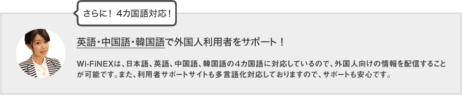 Wi-FiNEXは、日本語、英語、中国語、韓国語の4カ国語に対応しているので、外国人向けの情報を配信することが可能です。また、利用者サポートサイトも他言語化対応しておりますので、サポートも安心です。