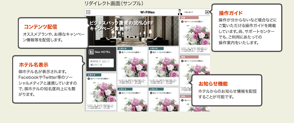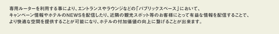 専用ルーターを利用する事により、エントランスやラウンジなどの「パブリックスペース」において、キャンペーン情報やホテルのNEWSを配信したり、近隣の観光スポット等のお客様にとって有益な情報を配信することで、より快適な空間を提供することが可能になり、ホテルの付加価値の向上に繋げることが出来ます。